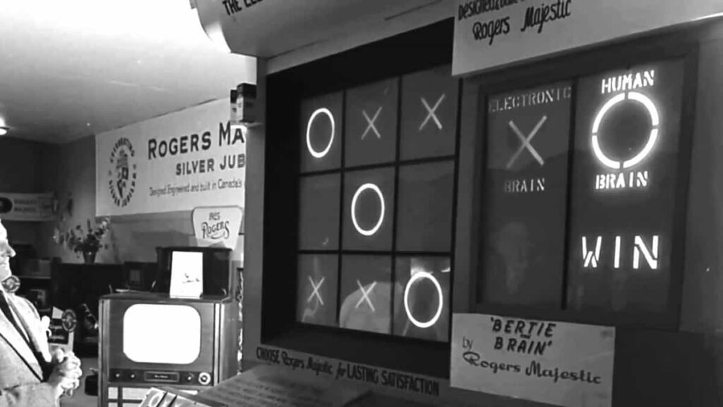 Il primissimo videogioco si chiamava Bertie the Brain. Era il 1950 quando un ingegnere canadese, Joseph Cates, volle dimostrare l’efficienza di una valvola da lui inventata. Lo fece con un grosso macchinario che permetteva di giocare a tris contro un computer dalla difficoltà regolabile: fu il primo esempio di interazione uomo-macchina. Tuttavia, molti non lo considerano un vero e proprio videogioco perché non utilizzava uno schermo tradizionale, ma delle lampadine.